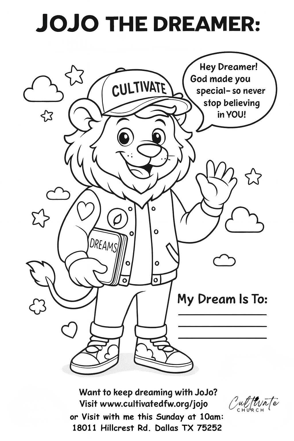 Meet JoJo the Dreamer™, the official kids mascot of Cultivate Church. Download free coloring pages, a 30-day devotional, and dream journal resources that help kids discover identity, character, and purpose. You were born for more.